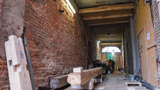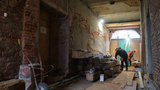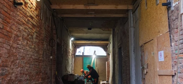 Dach jest już częściowo pokryty, trwają ostatnie etapy robót dekarskich, a w środku ekipy zajmują się murowaniem, odtwarzaniem konstrukcji drewnianej oraz renowacją charakterystycznych żeliwnych słupów. W piwnicach uzupełniana jest hydroizolacja, a w budynkach prowadzone są prace wykończeniowe: montaż zabudów z płyt gipsowo-kartonowych, gruntowanie i malowanie ścian, układanie kurtyn pożarowych oraz montaż parapetów. W wielu pomieszczeniach trwają też prace przy renowacji posadzek – to jeden z najbardziej efektownych elementów całego projektu.