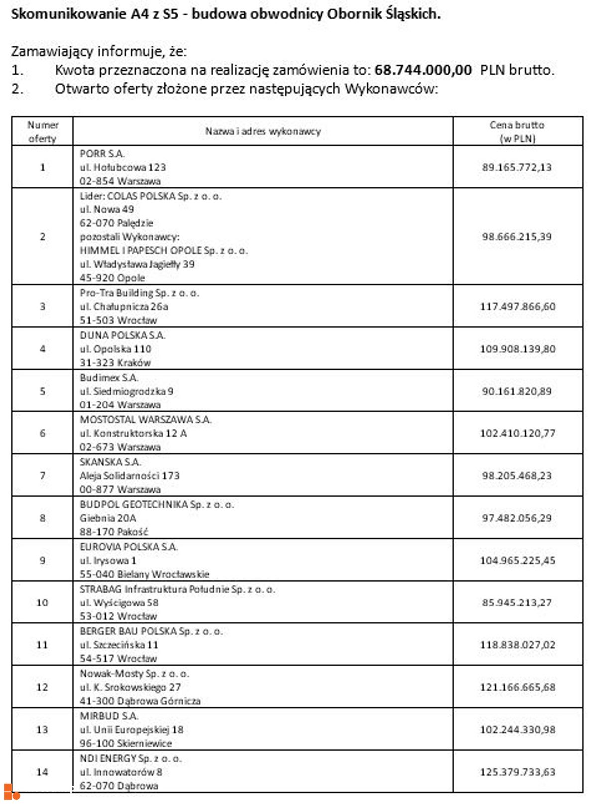 Na realizację inwestycji przewidziano 36 miesięcy od momentu podpisania umowy. W przetargu złożono aż 14 ofert. Najniższa z nich opiewa na 86 mln zł, a najwyższa na 125,3 mln zł.