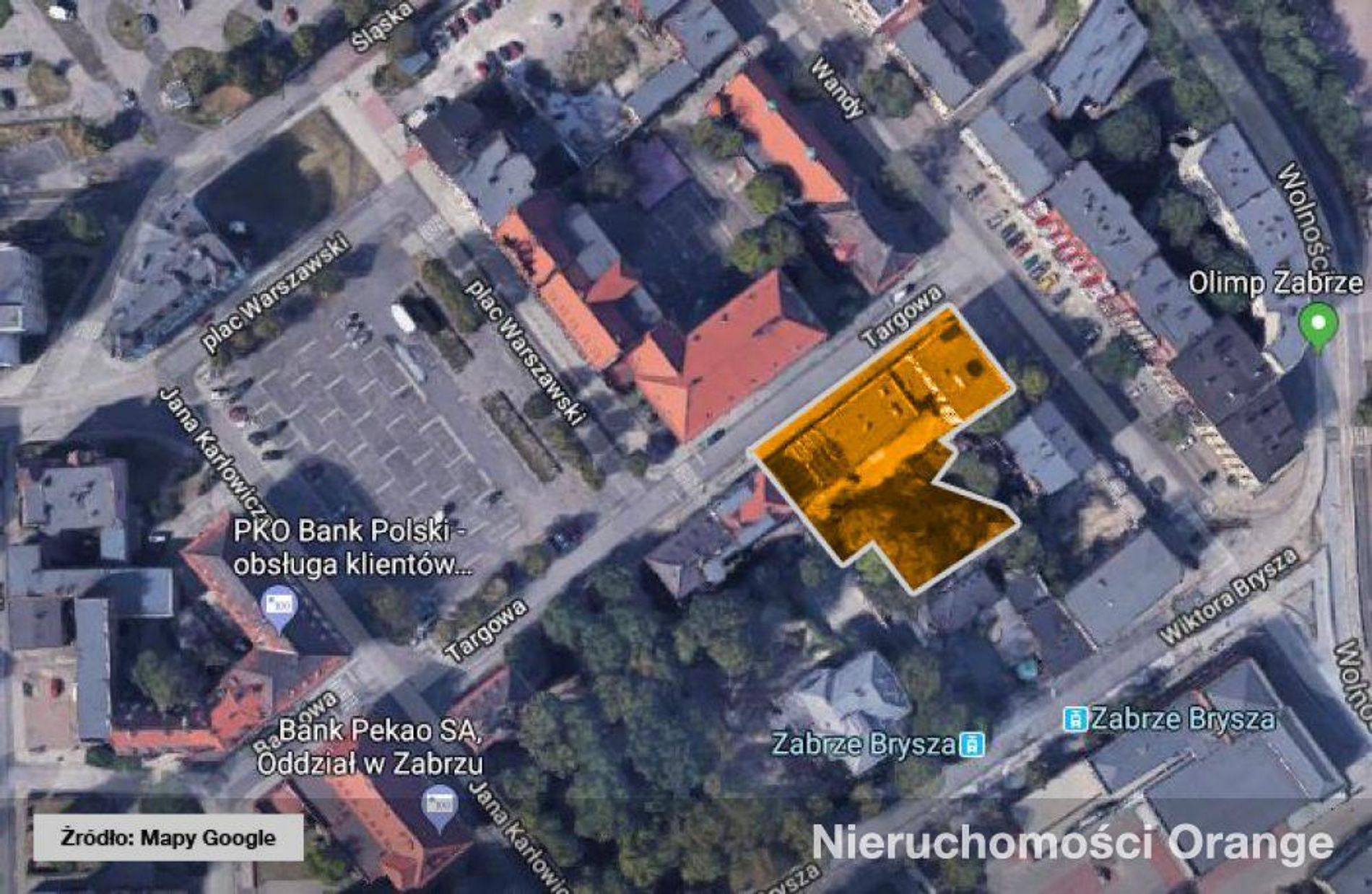 Księga wieczysta prowadzona przez Sąd Rejonowy w Zabrzu, VI Wydział Ksiąg WieczystychDział I-0 - wpisano działki ewidencyjne o nr: 490/11, 653/12, 656/8, 513/15, 515/14, 791/14 – Zabrze , ul Targowa – oznaczona jako BI- inne tereny zabudowaneo łącznej pow. 0,1537 habudynek biurowo-techniczny – Targowa, Wandy – o pow. użyt. 632,30 m2; kub. 2 405,00 m3budynek techniczny (centrala) – Targowa, Wandy – o pow. użyt. 702,36 m2; kub. 3 606,00 m32 garaże – Targowa, Wandy – o pow. użyt. 93,30 m2; kub. 420,00 m3 Dział I-SP – działki gruntu oddane w użytkowaniu wieczystym – 2089.12.05Dział II – jako właściciel wpisany jest Skarb Państwa; jako użytkownik wieczysty Orange Polska SADział III – jest wpis-ostrzeżenie o toczącym się postepownaiu o ustalenie drogi koniecznej na rzecz Wspólnoty Mieszkaniowej przy ul Targowej 2A w ZabrzuDział IV – brak wpisów.