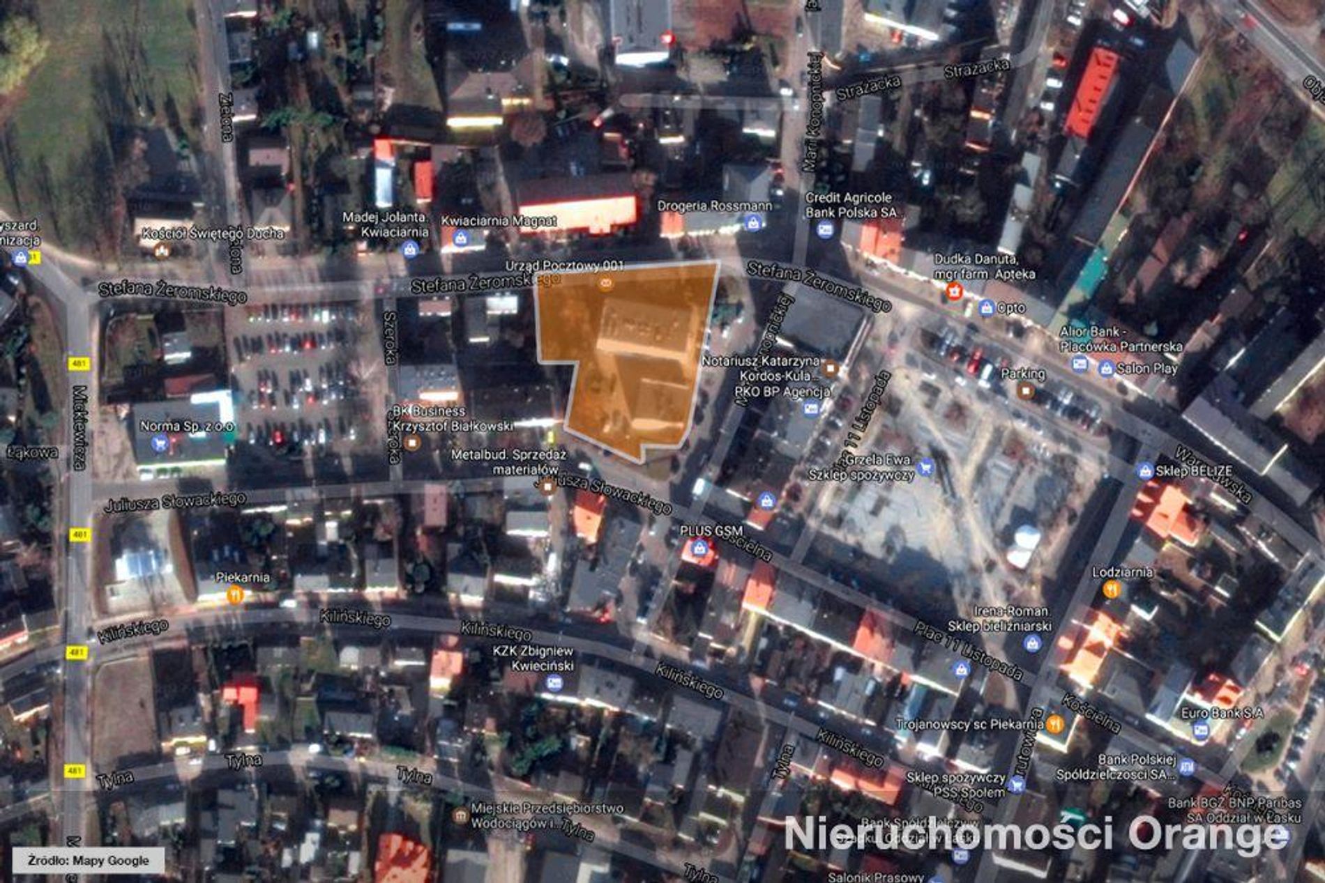 Przedmiotem sprzedaży jest prawo użytkowania wieczystego działki nr 114/2 o powierzchni 2869 m², w skład której wchodzą dwa budynki biurowe o łącznej powierzchni 1 850 m².Pierwszy budynek jest obiektem wolnostojącym, podpiwniczonym, o trzech kondygnacjach naziemnych. Jego powierzchnia wynosi 1 477,50 m². Powierzchnie wewnątrz zaaranżowane są w układzie gabinetowym i wykorzystywane na cele biurowe. Do budynku prowadzą dwa niezależne wejścia, od strony ulic Żeromskiego oraz Marii Konopnickiej. Obiekt usytuowany w centralnej części działki.Drugi budynek o powierzchni 372 m² posiada dwie kondygnacje i jest niepodpiwniczony. Na parterze znajduje się pomieszczenie magazynowe oraz 2 garaże, a na pierwszym piętrze powierzchnie biurowe. Obiekt położony w południowo wschodniej części działki. Ściany w budynkach są murowane z cegły i ocieplone.Wjazd na teren nieruchomości odbywa się przez 2 bramy zlokalizowane przy ul. Słowackiego i ul. Konopnickiej. Do działki doprowadzono: sieć wodociągową, kanalizację, elektrykę, centralne ogrzewanie, sieć telefoniczną.Teren wokół budynków zagospodarowano na zieleń niską oraz parking.