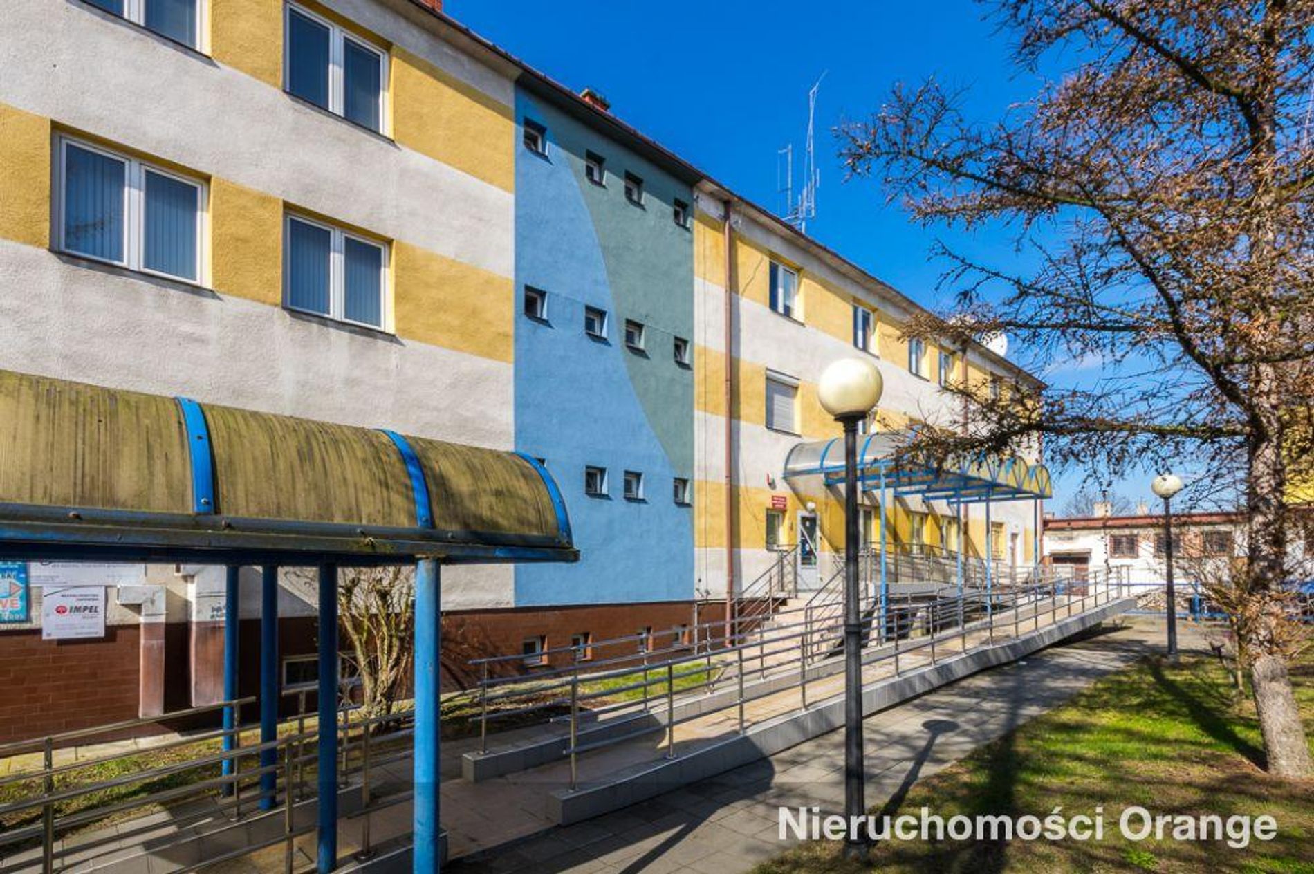 Teren nieruchomości jest utwardzony, ogrodzony, zagospodarowany zielenią, z dużym parkingiem dla samochodów od strony ul. Parkowej oraz podjazdem dla osób niepełnosprawnych urządzonym od strony ul. Żabiej.