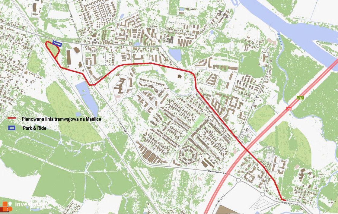 Nowa trasa tramwajowa ma się rozpoczynać od tej istniejącej w ulicy Pilczyckiej, a kończyć na planowanej pętli w okolicy skrzyżowania ul. Maślickiej, Królewieckiej i Głównej, przy nasypie kolejowym. Inwestycja obejmie także remont ul. Maślickiej. Do końca 2020 roku mają być gotowe projekt przebudowy drogi oraz koncepcja przebiegu trasy tramwajowej.